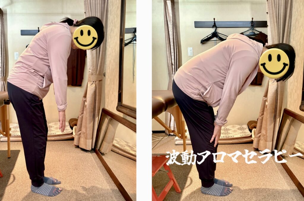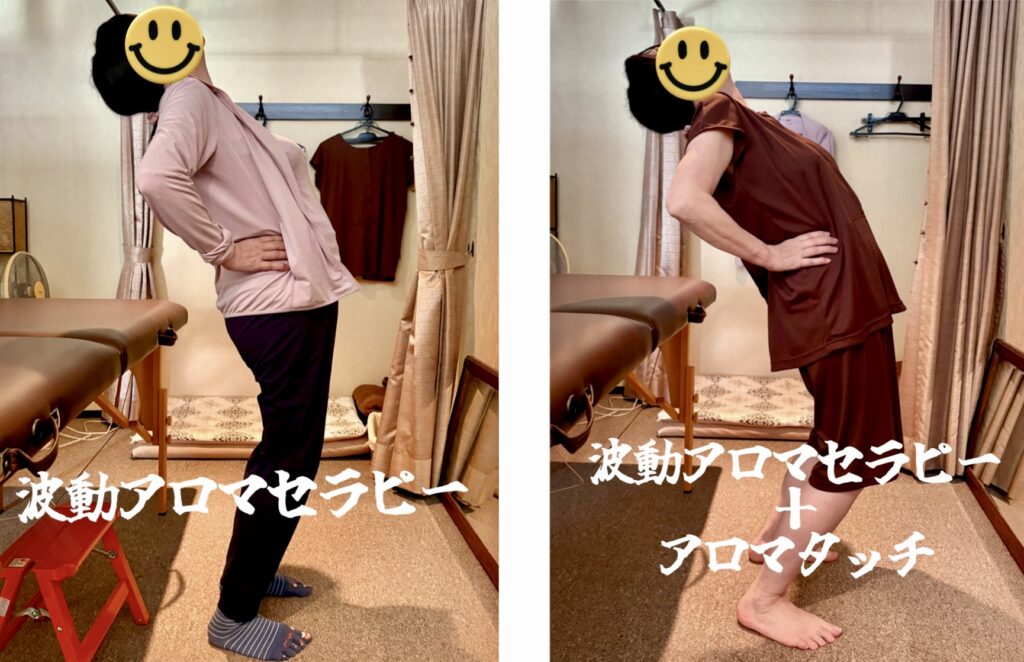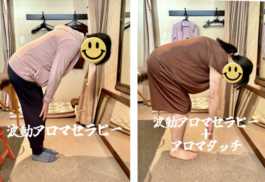 次に8種類のアロマオイルを使った #ハーモニータッチ でアプローチすると、痛みで可動域が狭かった前後屈が楽にできる様になり、立ち上がる動作も痛みが無くなり素敵な笑顔がこぼれました😊