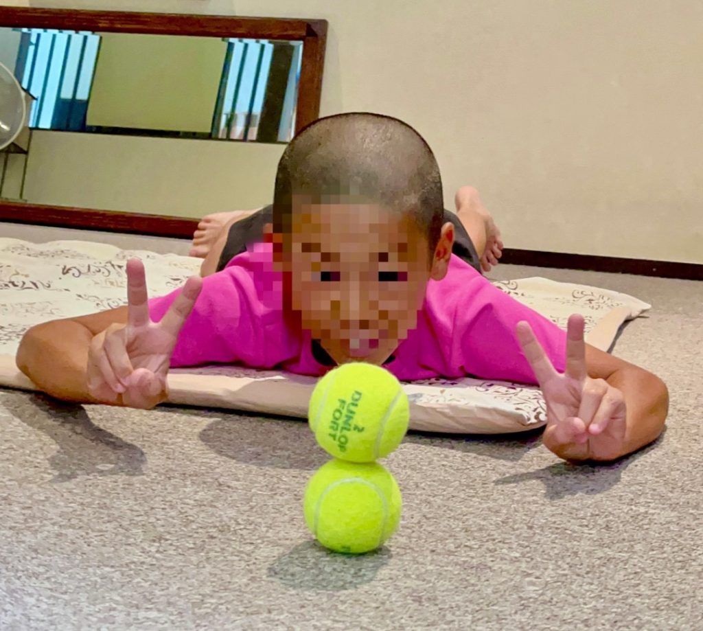集中力アップのテニスボール積みトレーニング、初めの頃は全く出来なかったのが今では20秒ほどで完成してしまいます!