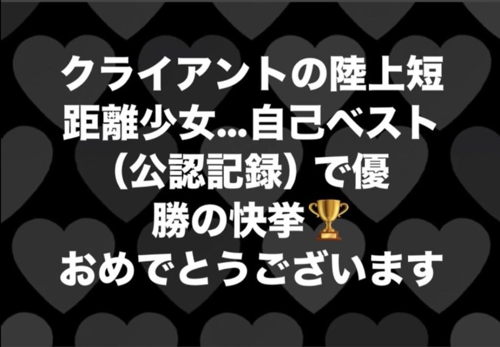 クライアントの陸上短距離少女Nちゃん…自己ベスト(公認記録)で優勝の快挙です(^^)v 小さな体でストライドを大きくしようとして足が流れる→→フォームの改善に取り組むが中々上手くできない→→タイムが伸びない…のジレンマに、「欠点の克服よりも自分の持ち味... -