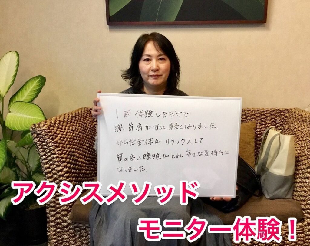 先日ご来店のアクシスメソッドモニターMさんに感想のコメントを頂きました☘ 『1回体験しただけで腰・肩・首が凄く軽くなりました。からだ全体がリラックスして質の良い睡眠がとれ幸せな気持ちになりました』 お役に立てて良かったです😊👍 明日1/20~2/25...