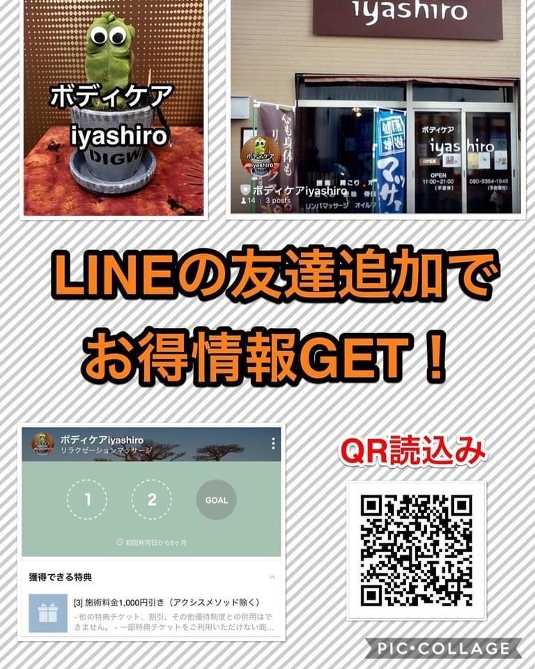 【お知らせ】 当店では・・「ボディケアiyashiro」の「ラインオフィシャルアカウント(LINE@)」を開設しています! LINE版ホームページというイメージでしょうか(^_-)-☆ 美と健康、スポーツ等のお得な情報や特典を配信中です! 過去の投稿や写真・動画も... -