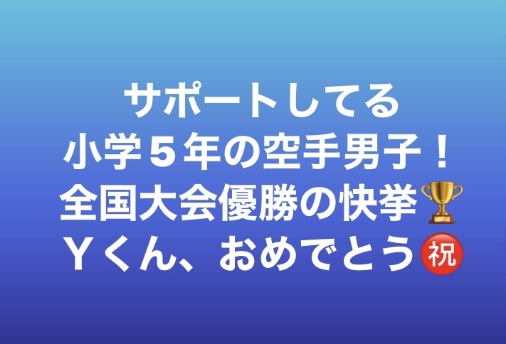 サポートしてる小学5年の空手少年Yくん、全国優勝の快挙です! お母さんいわく、身体能力の成長はもちろん、メンタルの成長が著しいそうです! クライアントさんの活躍は嬉しいですね(≧∀≦) これからも全力でサポートさせて頂きます!